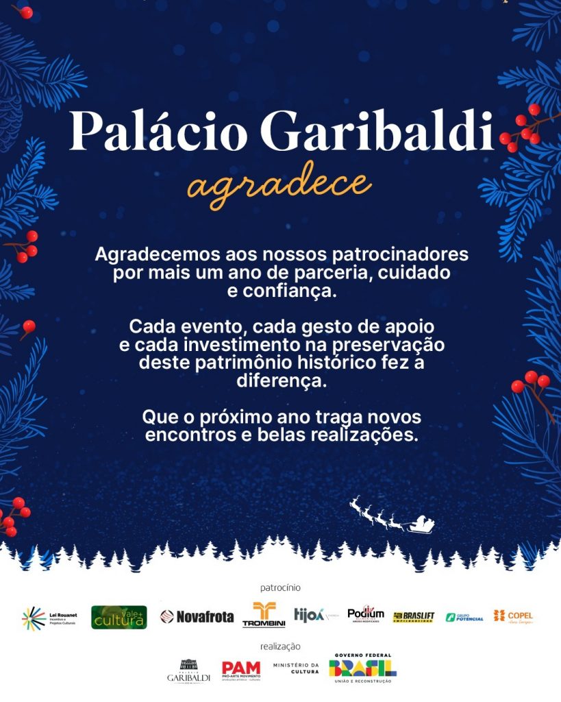 A Associação Giuseppe Garibaldi anunciou nesta quarta-feira (10), pelas redes sociais, o agradecimento aos patrocinadores pelo apoio prestado ao longo do ano às atividades realizadas no Palácio Garibaldi, localizado no Centro Histórico de Curitiba.